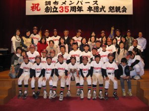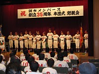 ことし創立35周年を迎えた調布メンパースは12月13日、調布市文化会館たづくり・大会議場にて、記念懇親会を開催しました。OB選手・コーチ・父兄、来賓の方々を交え、参加者は総勢150名超。長友調布市長の祝辞に続き、初代監督で創立者の金城氏や調布市少年野球連盟・林会長から、メンパース創立当時のエピソードの数々を披露していただきました。