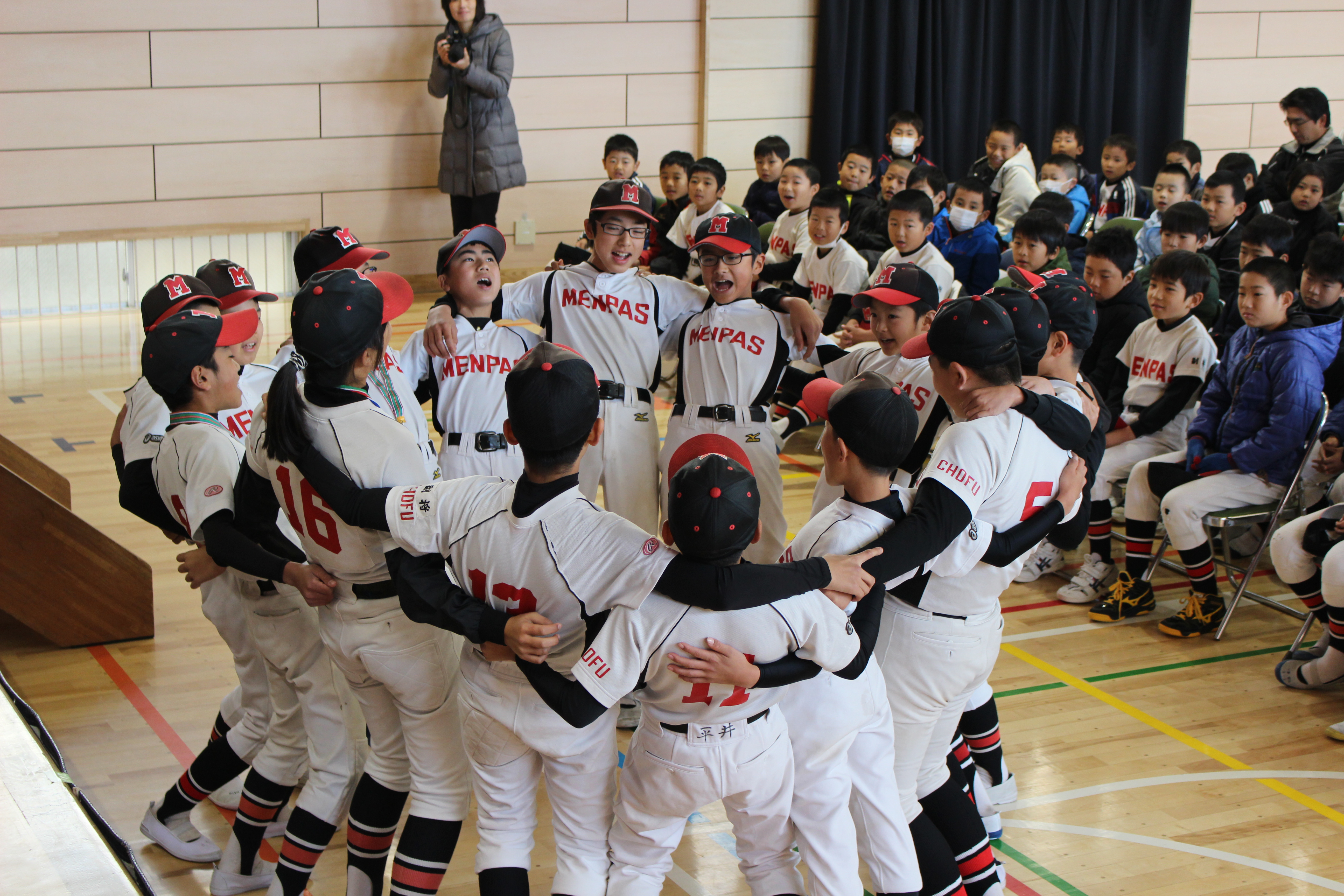 卒団生からチームの記念品として、コンパクトで持ち運びが便利なトスバッティングなどで使えるネットが贈られました。ちょっとした、時間や場所があれば、少しでも練習ができるので有効に活用してください。