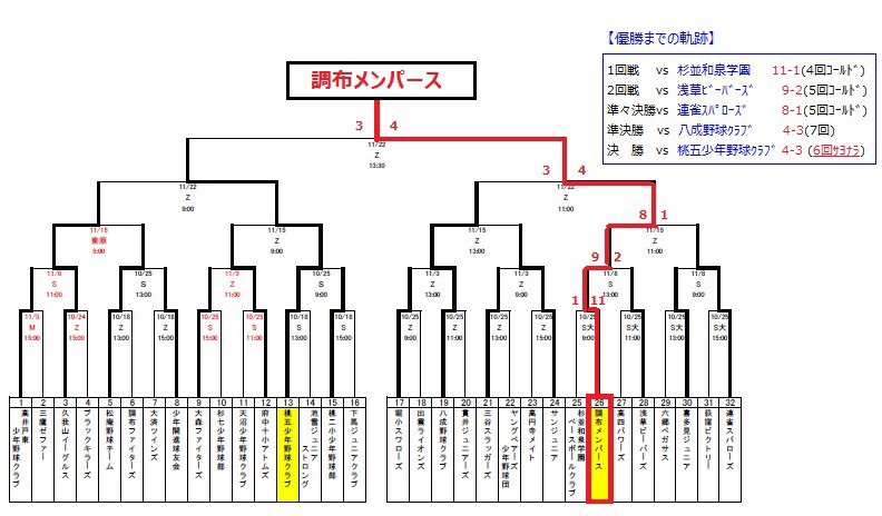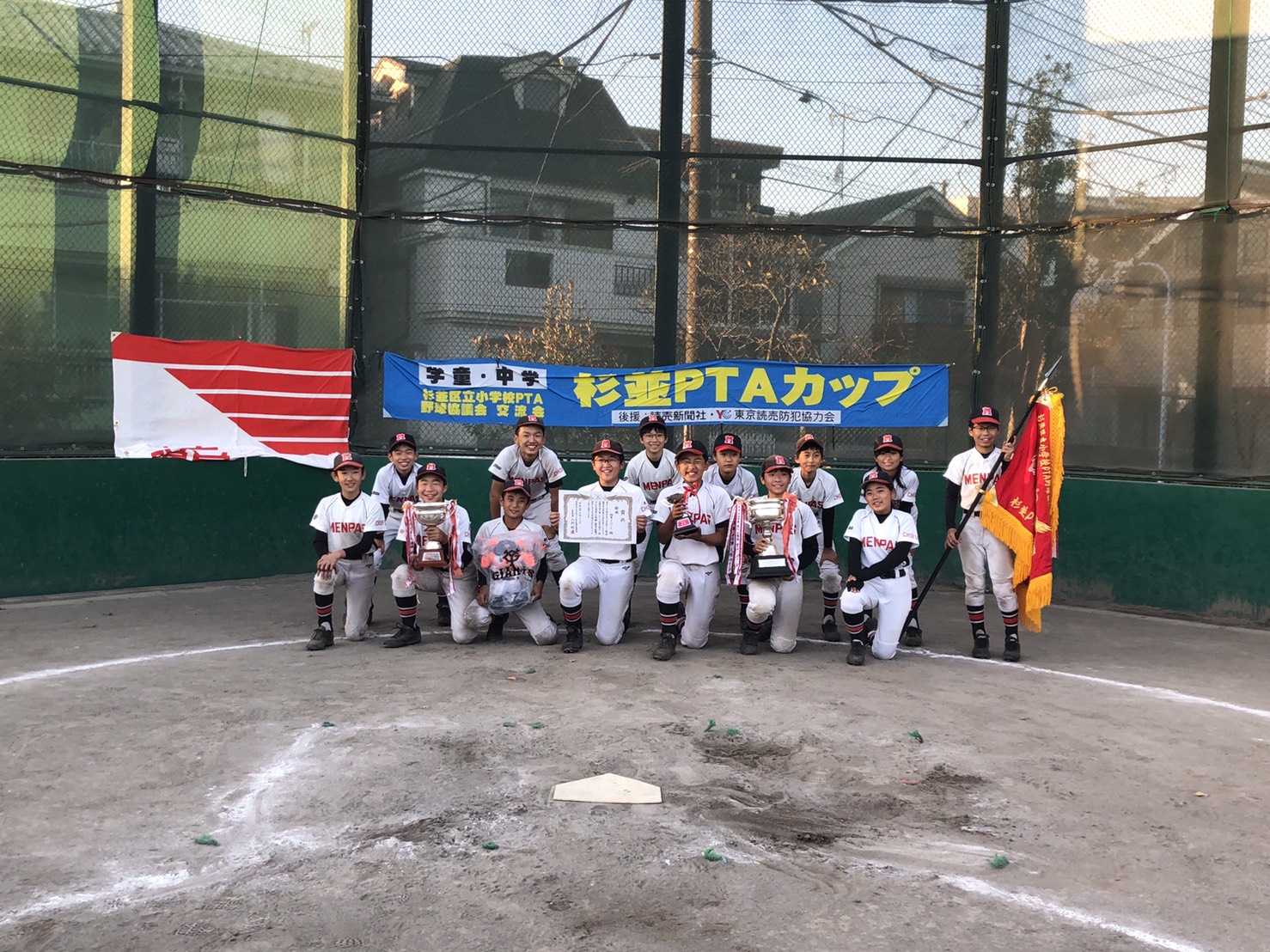 調布メンパースは、同日行われた準決勝を逆転で制して勢いに乗り、直後の決勝では、杉並の強豪 桃五少年野球クラブと対戦。最終回をコールされた6回表に3-3の同点に追いつかれながら、全員団結して諦めず臨んだ最終回の裏、2死一塁から主将知本が2ストライクからの3球目を叩いて左翼越三塁打!劇的サヨナラ勝利による優勝を勝ち取りました!