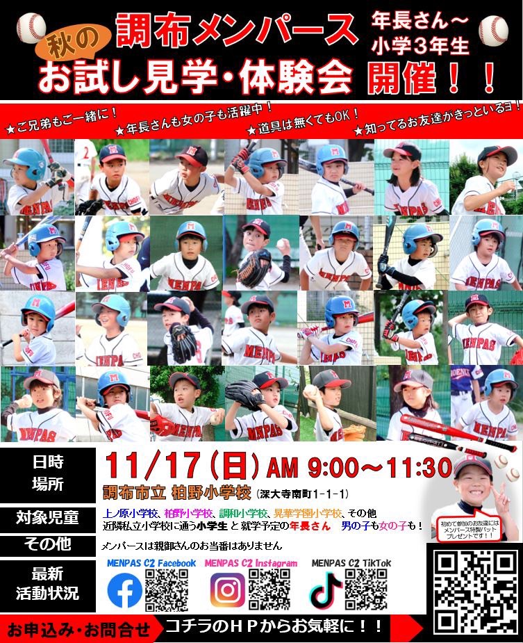 お知らせ メンパース秋の体験会 開催しました!! 2024/11/20 CHOFU_MENPAS 11/17(日)、気持ちの良い秋晴れの中 たくさんのお友達が集まってくれ、元気に野球ごっこを楽しんでくれました。少し汗ばむくらいの陽気だった為 最後は夏場限定の水風船バッティングで 大盛り上がりして終了。同伴頂いた親御さまもお疲れ様でした。メンパース低学年チームは 毎週日曜に柏野小で活動しています。是非またいつでもお気軽に遊びにお越しください!また皆と会えるコト、チーム一同楽しみにしております! 低学年組(年長さん~小学3年生)の活動最新情報は Facebook、Instagram、TikTok からどうぞ!! Facebook Instagram TikTok Facebook で共有するにはクリックしてください (新しいウィンドウで開きます) Facebook クリックして X で共有 (新しいウィンドウで開きます) X いいね 読み込み中…